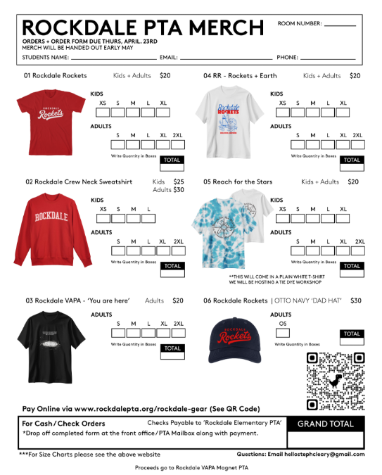 Pre-orders for PTA Rocket Gear are now available through April 23rd. We will deliver the goods to your student’s classroom in May. For more details, please see the order form at the bottom of this page. Go Rockets!